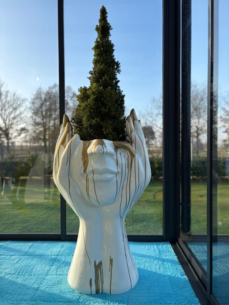Dostępna w galerii 🤍 Sztuka, która oddycha spokojem. Rzeźbiarska forma dłoni w bieli z delikatnymi złotymi akcentami, trzymająca żywą zieleń – balans między naturą a designem. Idealna do nowoczesnych wnętrz, ogrodów zimowych, lobby hotelowych i przestrzeni, gdzie liczy się detal oraz emocja. Każdy egzemplarz to ręcznie wykańczona forma – unikat.